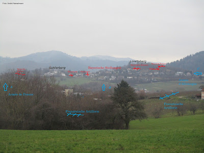 | Die französischen Angriffstruppen der Armée de France gegen den Schlierberg etwa um 15 Uhr. - The French troops for the attack from the Armée de France against the Schlierberg at around 3 pm. |