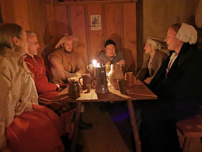 After everything was done for the day and the mercenaries' oven was ready enough to bake small loaves of bread in, a lot of people came to my inn. The mercenaries and the fine painter from Cologne enjoyed my beer and sausage until the spaetzle with cabbage was ready. People feasted, drank and danced to the flute. When the mood was already at its peak, someone from my household rushed up the stairs and pointed outside. Apparently an angry mob with torches had gathered there. I ran downstairs and resorted to my tried and tested method and poured beer into everyone's mugs at the expense of my neighbor from "Leoweiler". Afterwards we went up to the taproom, where the evening ended with a game of dice and music. "We went into the field" got countless new verses that reflected the events of the day, especially about Count Mansfeld and how the farmers were put in the pan.